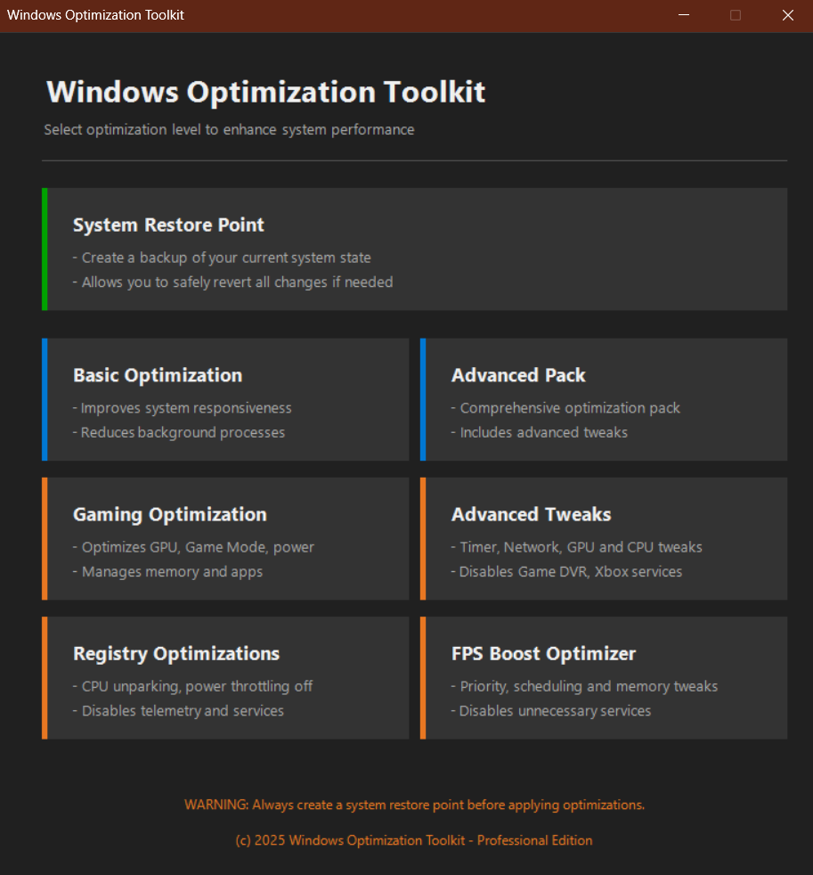 The Windows Optimization Toolkit is a powerful, one-click PowerShell tool designed to clean up, speed up, and optimize your Windows system for everyday use and gaming.